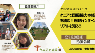 ケニアの未来は、『子どもたちをすくい上げられるしなやかな社会を作る』ことを目指し、これまでケニアの草の根地域社会で、早期妊娠予防活動や非行防止活動、個別教育支援事業を通じた子どもの支援を行ってきました。 現在、現地での事業展開に加え、ケニアの活動を日本から支える国内事業を実施するため国内インターンが活動しています。業務は多岐にわたり、個人のペースで進めることができるため、事務局スタッフと相談しながらやってみたいことに挑戦できる環境が整っています。 今回のイベントでは、現在の国内インターンがケニアの未来での仕事について語ります! 〇ケニアの未来で国内インターンをしようと思ったきっかけ〇国内インターンの実際の業務内容〇国内インターン自身の将来について といった、ケニアの未来で実際に国内インターンを勤めたからこそお話できることがたくさんあるかと思います。 また、国内インターンとして活動すると現地インターンへ応募することが可能になります! 現地インターンに関心をお持ちの方もこの機会にぜひご参加ください! ☆ケニアの未来のインターン(国内・現地)に興味がある☆アフリカをはじめとする途上国支援に興味がある☆国際機関やNGOで働くことに興味がある☆NGOの仕事を知りたい☆学生のうちに途上国支援に関わってみたい☆地域住民参加型開発、子ども・青年の問題に関心がある こんな方に是非おすすめしたい内容になっております! ◎カメラOFF/ミュートで参加OK!◎イベント後半にはQ&Aの時間も設けます!◎学生から社会人まで、年代問わず参加大歓迎です! 現在、ケニアの未来では、国内インターンを募集しております!この機会にぜひ、ケニアの未来の活動やNGOでの仕事を経験してみませんか? 登壇者プロフィール: 湯浅さくら:大学3年で、現在休学中。専攻は文化人類学。ケニアの未来に2024年7月から国内インターンとして関わっており、2025年8月から現地インターンとしても活動をしている。 河田美晴:大学3年で現在休学中。外国語学部でスワヒリ語を専攻している。2024年11月から国内インターンとして関わっている。 _____________________________…